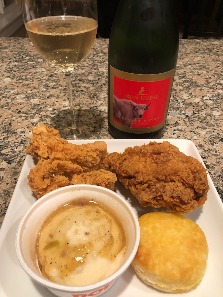 First, I tried the wine with the crusty, oily skin. The acid in the wine does an excellent job of neutralizing the fat and salt. Also, the subtle sweetness compliments the salt very nicely. I got the spicy chicken, but because the alcohol content in the sparkling wine isn’t too high, so the heat isn’t accentuated. Then there’s the bread notes of the wine. These notes develop during the aging process as yeast cells are placed into the wine to ferment the sugar into alcohol. When the alcohol level reaches a particular range, or when the sugar drops below a certain range, the yeast can no longer survive and die off. The yeast is left in the bottle and becomes known as lees. When a sparkling wine makes note of ‘lees time’, they are quantifying this length of time. The longer the lees time, the greater the notes of baked bread, baguette, or biscuits, will be when you taste the wine. The bread qualities in the wine also enhance the pairing with the breaded chicken and the buttered biscuit that came on the side! Overall, this was a fun and delicious experiment!! Would highly recommend!