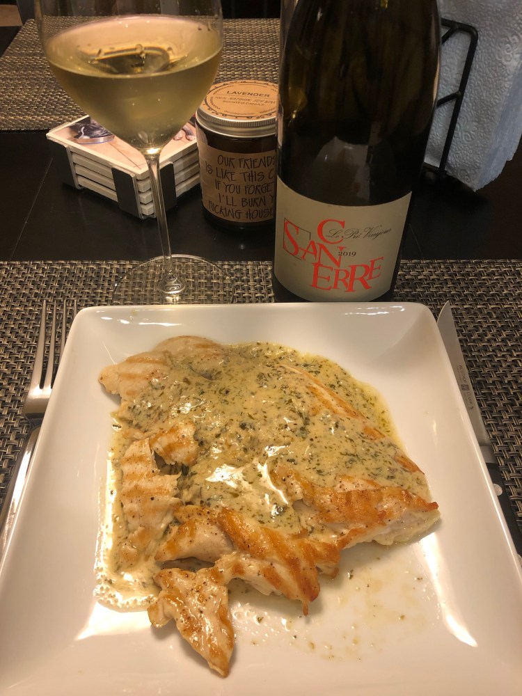 I decided to pair my Sancerre with an herbed goat cheese topped grilled chicken breast. The pale lemon hued wine had a pronounced nose of lemon peel, green grass, unripe green apple, gardenia, and key lime. When I tasted it, the acid wasn’t as sharp as some representations of this varietal but was still crisp and refreshing. The acid in the wine accentuated the acid in the goat cheese. The Sancerre rinsed flavors of lemon pith, lemon juice, gardenia, key lime and gardenia over my palate, in addition to hints of green grass that married well with the herbal notes in the cheese. The combination is lovely and has a lengthy history in this region. What a great snack on a warm summer evening!