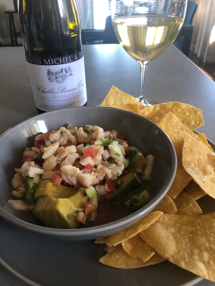 When we poured our glasses, the medium lemon color from the bottle aging of this wine was very evident. The family stopped using oak to age their wines in the 1960s and completely switched to stainless steel. Oak aged white wines tend to be deeper in color. This color depth was accomplished with this wine by extended aging in the bottle. White wines deepen in color as they age, while red wines lighten in color. Since I am on vacation in Sonoma, finding a food pairing that was simple to prepare, was a tiny bit of a challenge. I settled on picking up some fish ceviche from the local Mexican restaurant. Chablis is excellent with riper cheeses and fresh seafood like scallops, shrimp, crab, and white fish. The wine had notes of honeysuckle, gardenia, meyer lemon juice, wet slate, and chalk. The lemon juice accentuated the citrus juices used to cook the ceviche while the floral notes paired well with the cilantro. The high level of acidity in the wine was well balanced with the acidity in the ceviche. When the level of acidity in food is higher than that of the wine, the wine can seem thinner or flabby on the palate. The corn tortilla chips were a nice addition because the hint of sweetness in the corn matched that of the honeysuckle notes. Overall, this was a fun, and easy pairing for a warm summer afternoon snack!