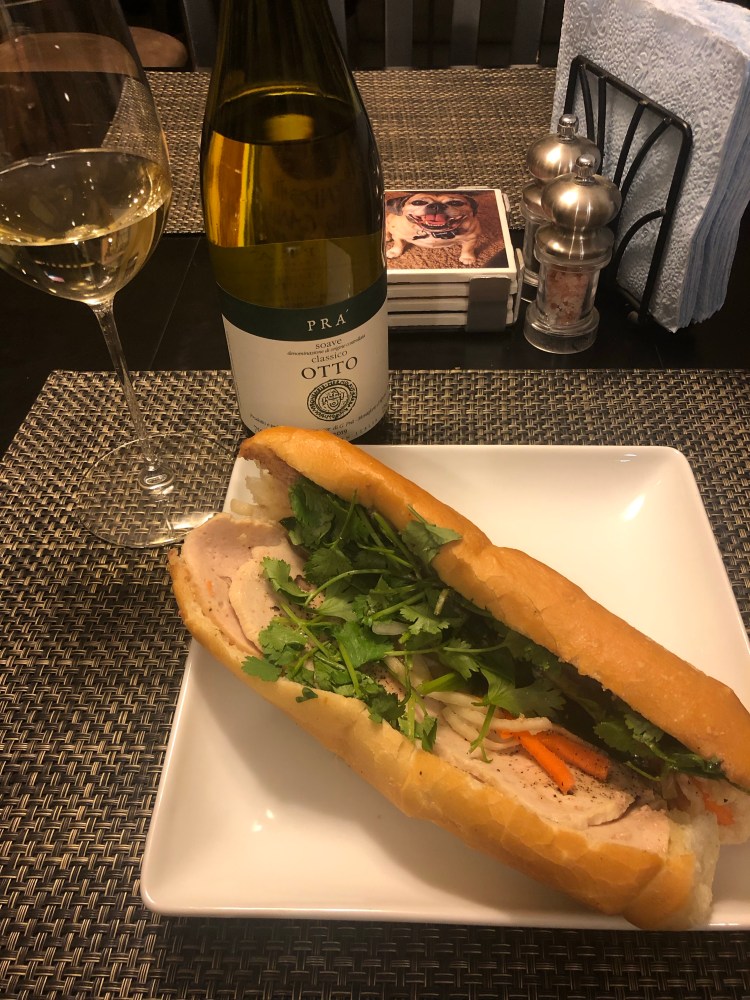 The wine I selected is a 2019 Azienda Agricola Pra’ Soave Classico Otto. I decided to pair it with a Vietnamese cold cut banh mi sandwich. If you are unfamiliar, it is an ode to the French influence on Vietnamese culture. It consists of a french roll topped with pȃté, vietnamese mayonnaise, cilantro, jalapeño slices, cucumber wedges, pickled diakón and carrot sticks, and a choice of meat (BBQ pork, grilled pork, tofu, and pork loaf (chả lụa)) are all very common options. The wine is a pale straw yellow with watery legs that rush down the sides of the glass. It smells of tropical fruits like juicy pineapple, banana, and mango, with citrus notes of bitter lemon pith and lime peel. This dry, light bodied, medium alcohol wine is a bit less acidic than the Orvieto I tasted a couple weeks ago but still has a pleasant bite to it. Bright flavors of green apple, slightly under ripe pineapple, green pear, white peaches, bitter lemon pith, all with a touch of wet slate, immerse the palate. These brilliant fruits paired well with the salty pȃté slathered on the sandwich. The green veggie notes brought out the green fruit notes and minerality in the wine. The citrus brightened up the fresh fillings. Then there was the acid to downplay the fatty components of the sandwich. The wine and sandwich complemented each other nicely but were not outstanding. I would still have the pairing again though!