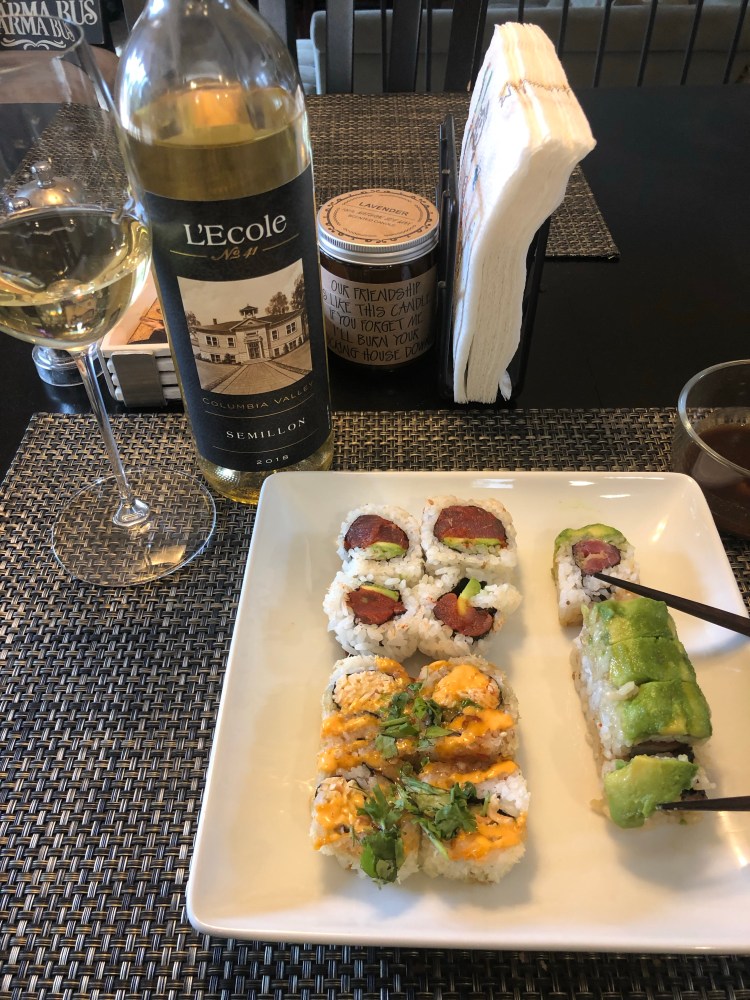 The bottle I selected for this week’s tasting is a 2018 L’Ecole Sémillon. This vintage was a blend of 85% Sémillon and 15% Sauvignon Blanc. Since it is typically bright and citrus forward, I decided to pair it with sushi. The light brassy hay colored wine had aromas of lemon pith, key limes, white grapefruit, honeysuckle, lemongrass, and green apple. The sushi I selected were rolls consisting of tuna (my favorite), avocado, and assorted sauces. This wine has a high alcohol content, so limiting the amount of spice, either sauces or wasabi, would be ideal as they accentuate the sensation of the alcohol. The sweeter elements of the sushi, the sriracha mayo and sweet chili sauce, were excellent counterbalances to the acid but also addicting with the citrus notes. One of the rolls was topped with cilantro. This was brilliant with the honeydew and floral notes the wine exhibited. Fresh tuna and bright citrus were fantastic. The Marvelous roll was filled with tempura shrimp and fresh tuna, then topped with avocado and garlic sauce. The pairing with the wine was phenomenal. The garlic sauce added a savory sweet aspect, while the other items were rich enough to balance the wine. I will definitely be adding this wine variety to my go to list the next time I have sushi!