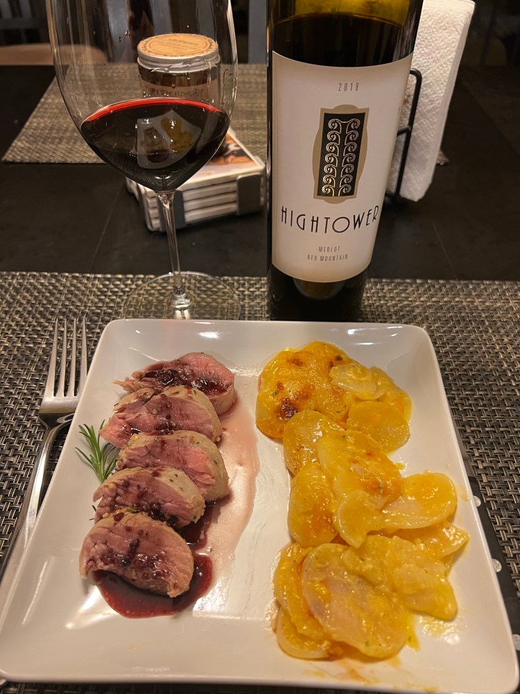 This week, I’m pairing a 2018 Hightower Red Mountain Merlot with a blackberry pork tenderloin and scalloped potatoes. The label lists this wine as being 91% Merlot and 9% Cabernet Franc. The Cab Franc will add complexity in the form of floral notes and hints of blue fruit. This ruby wine is on the cusp of being completely opaque. It has lazy legs that gently slide down the goblet. Aromas of slightly under ripe blackberry, blueberry, vanilla, baking spices, and dark chocolate emanate from the glass. The wine is dry with significant levels of acid. It has beautiful, luxurious tannins that caress the palate. The flavors of blackberries in both the sauce for the tenderloin and wine are lovely together. The earthiness of the fresh rosemary in the sauce complements the fruit, floral and earth notes of the wine. The sharpness of the cheesy potatoes is addicting with the fruit and acid the Merlot exhibits. The flavors of vanilla and blackberry linger on the palate long after the wine is gone. The warming sensation felt as the Merlot makes it through my body is a good indicator of its high alcohol content (14.7% as listed on the label). Overall, this wine is a classic example of the level of quality that can be found in the wines that originate from Red Mountain.