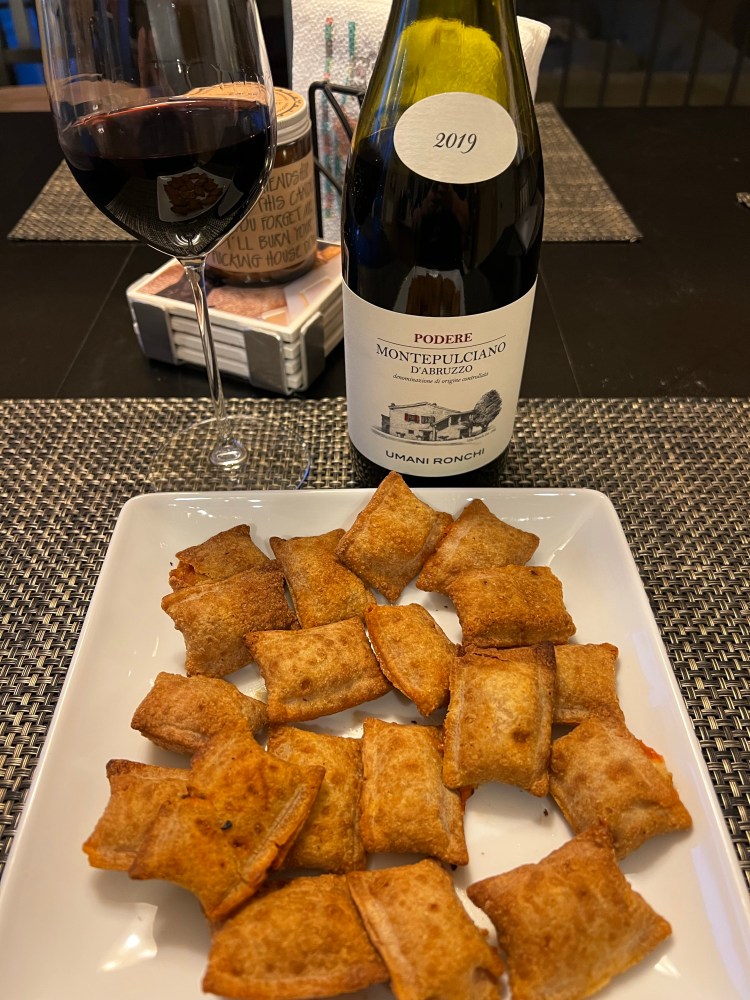 This week’s pairing will be for all those busy, exhausted parents out there that, after a long day, only have the energy to microwave something for their kids for dinner while they open a bottle of wine. After much thought, I decided to pair a 2019 Umani Ronchi Montepulciano d’Abruzzo with pizza rolls! Specifically, Kroger brand combination pizza rolls. A few months ago, a friend asked me to taste test the major brands and store brands to determine the best. The Kroeger was substantially better than the competition in texture, taste, and retaining the filling during the heating process. Montepulciano is wonderful with pizza or tomato based dishes so this seemed to be an ‘ideal’ Tuesday night dinner…or as ideal as pizza rolls for dinner can be! The nearly opaque wine had long legs that moved at the pace of a sloth down the sides of my glass. Upon sticking my nose into the goblet, I could discern aromas of cranberry, red currant, red cherries, rosemary, eucalyptus and dark chocolate. This medium bodied dry wine was crisp with a vibrant acidity and moderate levels of tannin and alcohol. The acid levels in the wine matched those of the tomato sauce. The herbal notes in the wine became more pronounced when combined with the tomato sauce as well. The perception of the soft tannins was even more subdued when consumed with fats in the pizza rolls. The taste of the wine leaves the palate before the pizza rolls do but that is to be expected for a wine that doesn’t take itself too seriously. Overall, this whimsical and effortless pairing was exactly what a night in the middle of the week calls for!
