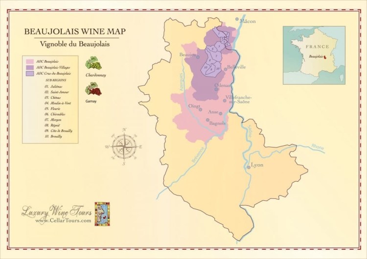 Beaujolais wines come in 3 different classification levels. The most common and inexpensive (although all 3 are quite affordable) is labeled as Beaujolais AOC or Beaujolais Nouveau. This wine can be made of gamay grapes from anywhere within the region and are the most likely to undergo carbonic maceration. This classification undergoes short fermentation times and Nouveau is released on the market the third Thursday of November each year, just in time for Thanksgiving. While some bottles are worthy of aging, if you purchase a Nouveau bottle, plan to consume it soon afterwards. The next highest level is Beaujolais-Villages AOC. This area is located in the middle of the region which has better soil quality and rolling hills. The hills have slopes facing southeast, which provides more direct and prolonged sunlight during the growing season. This helps ripen grapes and gives the wine more complexity. These wines may or may not undergo carbonic maceration. The highest classification is Beaujolais Crus. In this group, there are 10 recognized appellations (each is its own AOC). These wines will list the appellation name on the label instead of Beaujolais. These wines are produced in the northernmost portion of the region and are the most age worthy. They do not undergo the carbonic maceration process.