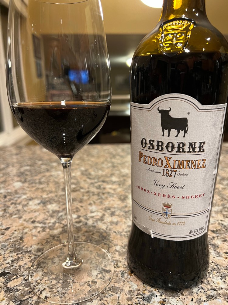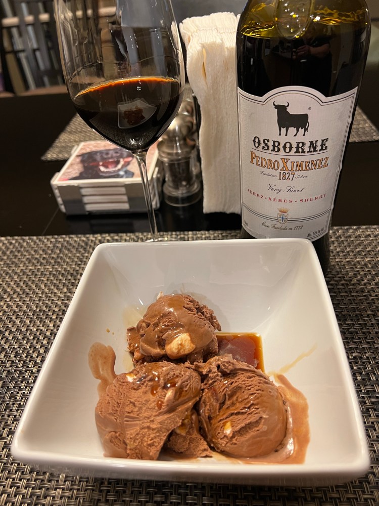 To pair my PX, I chose to cap off the week with a nice indulgence! I poured a bit of PX over my bowl of Tillamook Rocky Road ice cream. The Tillamook creamery is located northwest of the Willamette Valley AVA in northern Oregon. They have the best rocky road I’ve tried (I took it upon myself to compare the 5 my local grocery store carries and it was far and away the winner). The wine is a deep amber/brown color. I was expecting significant legs and while it had them, the viscosity from the high sugar and alcohol content coated the goblet. The legs would’ve gone backwards if they moved any slower. As the label indicates, it is a very sweet wine! The perceived sweetness is made less bold by the acid content. PX is known for its raisin notes and this bottle was no different! It had striking notes of toffee, chocolate, and coffee in addition to the raisins. When paired with the ice cream, the toffee notes were perfect with the chopped almond pieces. Drizzling PX over the top gave the entire bowl a bit of raisin, a great addition to the flavor profiles already in the bowl. With so many great elements, to compliment each other, this dessert was a great way to end Sherry Week!