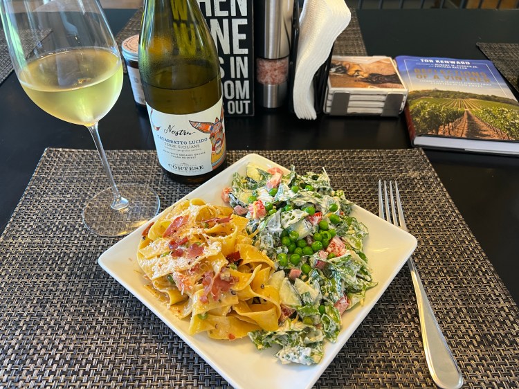 This week, I chose a 2020 Nostru Catarratto Lucido from Cortese. This bottle is from Terre Siciliane IGP. On the label, there is a donkey as an ode to the viticultural tradition in Sicily of man working side by side with his partner in the vineyards. I opted to pair this wine with a prosciutto and pea pappardelle. The Catarratto was a pale lemon color with grassy tone highlights. The aromas of lemon peel, white grapefruit, ripe pineapple, white peach, green apple, and ripe pear exploded from the bottle as soon as I removed the cork. The dry wine had a marked level of acidity that paired well with the light cream sauce. It contained a moderate level of alcohol, which was delightful on the mild spring afternoon I enjoyed the wine. The body of the Catarratto was more pronounced than I anticipated. Upon reading the production notes from the winery, they mentioned the use of lees aging and stirring for a period of 5 months (similar to that of last week’s Melon Blanc with sur lie). This decision by the winemaker increased the body of the wine, aided in balancing the acid, and imparted a delicate almond note to the finish of the wine. The body in the Catarratto also matched the sauce in the pasta dish. In addition to the aforementioned aromas, flavors of thimbleberry bramble, bitter lemon pith and wet stone added to the complexity of the wine. The finish evolved from the citrus, tree and tropical fruits to the bramble, stone and almond. The tropical fruits were accentuated by the prosciutto, peas and parmesan in the pasta, making for a delicious pairing. This lovely meal also added #184 to my list!