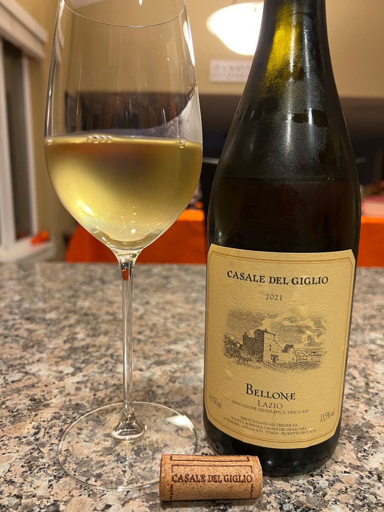 This week, I drank a 2021 Casale Del Giglio Bellone from Lazio IGT. According to the producer, the yields were controlled to create the best version of Bellone. The grapes were grown just beyond the coastal town of Anzio. The maritime influence provides cooling winds to aid in the preservation of acid. The winds also lead to water loss in the grapes. Bellone does have thick skins which can help mitigate this effect, but the winds still help concentrate the flavors. This wine has a medium lemon color and aromas of brioche, wet stone, white grapefruit, dried herbs, peaches, pineapple, sea salt and gardenia. On the palate, this wine has a sharp acidity that is very well balanced with a minimal touch of sweetness. It has a moderate level of alcohol and fuller bodied texture. The pronounced flavors of honeysuckle, grapefruit, wet stone, brioche, pineapple, peaches, sea salt, dried herbs, and gardenias all intermingle on the palate. These notes slowly fade on the extended finish. This wine is surprisingly complex and concentrated. This wine would be fantastic if paired with white fish or seafood.