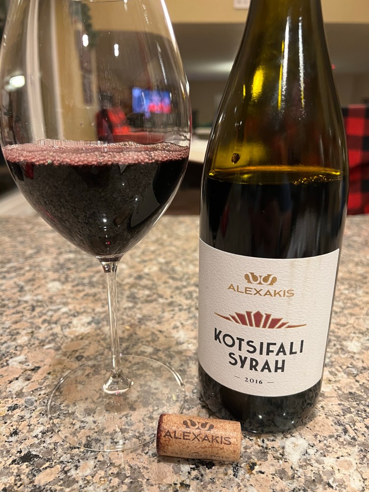This week I drank a 2016 Alexakis Kotsifali (60%) Syrah (40%) blend from Heraklion. Heraklion is located on the eastern side of the island, where a majority of plantings are located. The addition of Syrah makes this wine a deep ruby color. Despite being 7 years old, the inky color doesn’t show any signs of age. Aromas of ripe blackberry, dried red cherry, baking spices, licorice, black plum, and prune create a complex bouquet. Dried fruit is an indicator this wine has likely been aged for some time. On the palate, this full bodied dry, medium alcohol wine has a higher level of plush tannin. The acid is sufficient to balance the pronounced fruit notes and tannins. The blend of fresh ripe fruit and dried fruit indicate this wine has potential to bottle age longer but they also make this wine great to drink now. The dried cherries and prunes linger on the enjoyable finish. This wine would pair well with hearty winter dishes like beef roast, sausage, or stew.