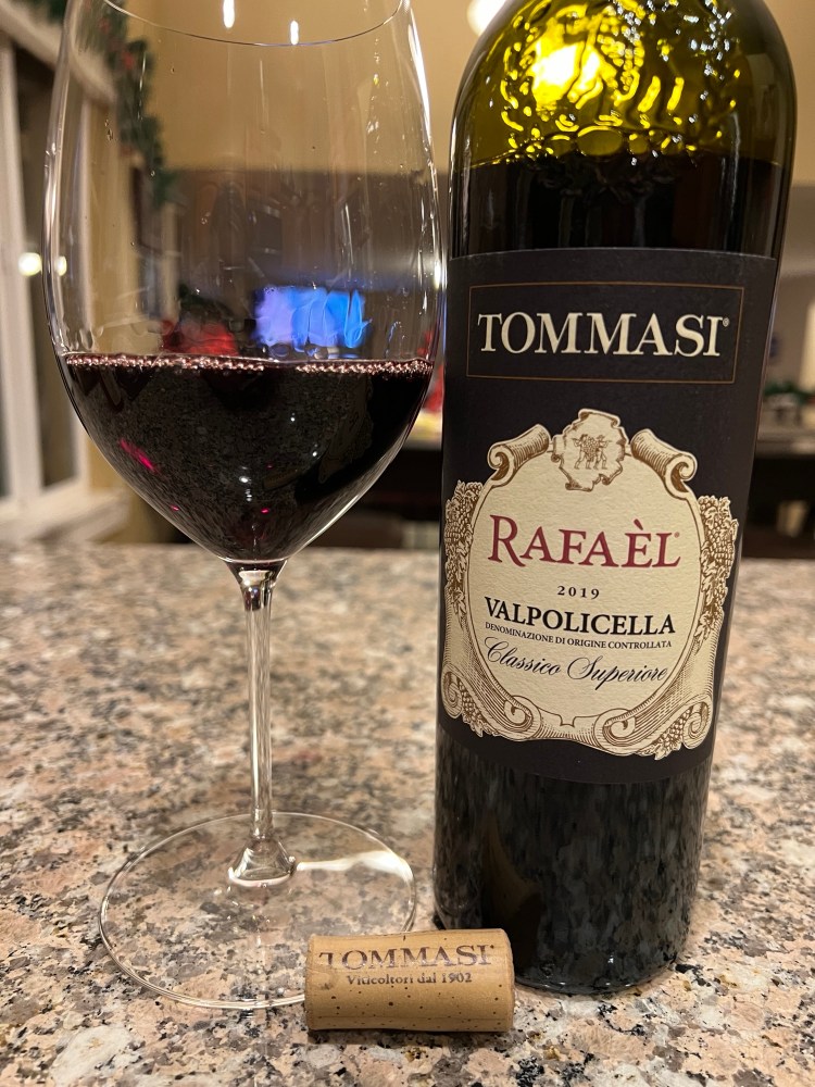 This week, I drank a 2019 Tommasi Rafaèl Valpolicella DOC Classico Superiore. The blend for this wine is Corvina (60%), Rondinella (25%) and Molinara (15%). Rafaèl refers to the name of the vineyard, which is located in the Valpolicella Classico area. It was the first vineyard planted by the founder Giacomo Tommasi. Vines are currently 30 years of age or older. The family has been making wine since 1902 and is now in its fourth generation. My glass of Valpolicella is medium ruby. It has aromas of ripe red cherries, cranberries, red currants, dried roses, and vanilla. On the palate, this fuller bodied dry wine has a moderate level of alcohol, refreshing acidity, and light smooth tannins. The ripe red fruit is bright and fresh. The fruit notes slowly fade on the prolonged finish. This would be a great wine to serve with a holiday charcuterie platter, beef roasts, or lighter meats like pork and turkey.