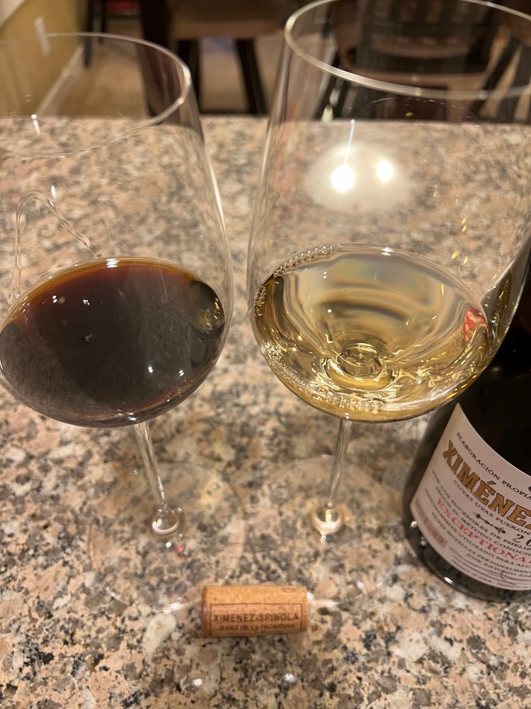 The wine I drank this week is a 2022 Ximénez-Spínola Exceptional Harvest Pedro Ximénez. Ximénez-Spínola is a 9th generation grower/producer. The winery also produces brandy and PX Sherry. The wine on the left is a fortified PX Sherry which has undergone extensive aging where it was exposed to oxygen. This created a concentrated, syrupy, brown wine that can be sipped or, as I prefer, used as a topping to rocky road ice cream. The wine on the right is this week’s wine, a medium lemon colored liquid. It has intense aromas of Meyer lemon, blanched almonds, jasmine, honeysuckle, glazed raised donut and white plums. This full bodied, moderate alcohol wine has a fresh acidity that balances its off dry character. There are flavors of yellow raisins and baking spices on the palate in addition to the aforementioned aromatics, all of which linger on the palate for a long finish. This wine does get aged in old American oak barrels, which provides some color. American oak has looser grains than French oak, which increases oxygen exposure. This can slightly decrease the time wine needs to age in barrel to get the desired oxidative effect during the aging process. The barrels do not add flavor to the wine because they are older. New American oak is known to impart more coconut compared to French oak that imparts more subtle vanilla flavor. This wine is unique and very enjoyable! I would pair this wine slightly chilled with a creamy seafood dish, like crab alfredo, as an aperitif, or with a cheese plate following dinner.
