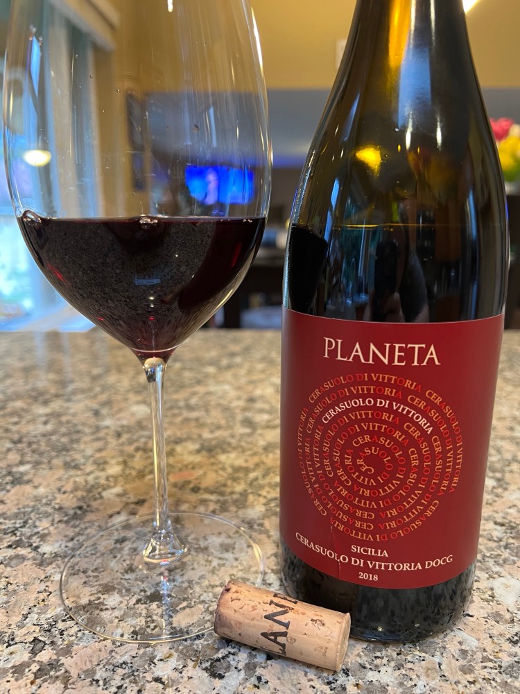 This week, I drank a 2018 Planeta Cerasuolo di Vittoria DOCG. This bottle was 60% Nero d’Avola and 40% Frappato. Cerasuolo is derived from ‘ceresa’, meaning ‘cherry’ in Italian. This medium ruby wine has aromas of ripe wild strawberries, red and black cherries, pomegranate, smoke, chalk, caraway, black pepper, and dark chocolate. This fuller bodied dry wine has a high acidity, medium alcohol, and a moderate level of ripe, well integrated tannins. The fruit notes lead on the front palate and are followed by the black pepper, caraway, chalk, and black pepper on the long finish. This wine has potential to increase in complexity with further bottle aging but is delicious now as well. The producer says this wine pairs well with pizza, but it would also be great with pork or chicken with a mushroom cream sauce. Would also be great with a mushroom risotto!