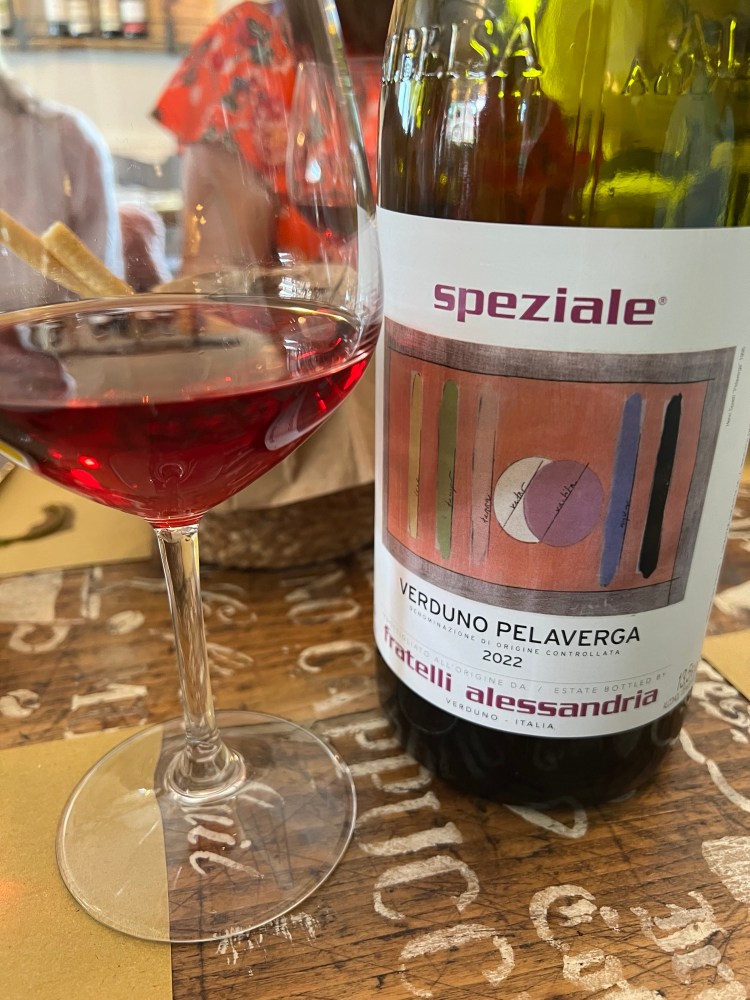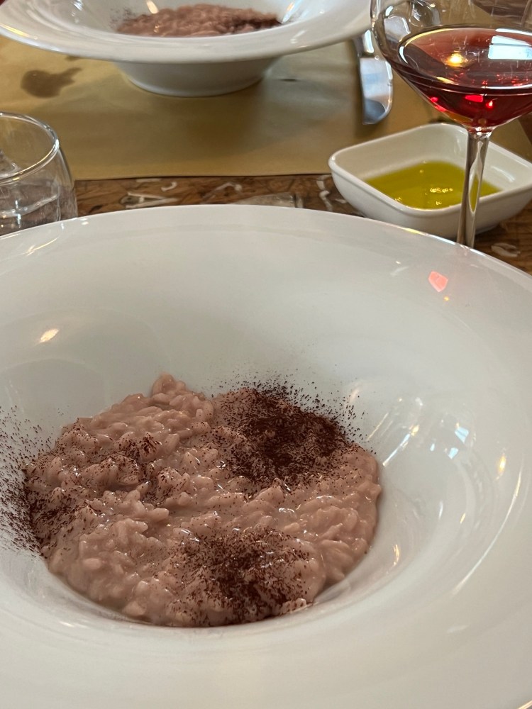 During my recent travels, I sampled Verduno Pelaverga DOC from a couple producers, Scarpa and Fratelli Alessandria, both from 2022. Both were pale ruby in color. The Scarpa bottle was served with a slight chill, which was perfect for a warm afternoon. The Fratelli Aslessandria was served at room temperature on a cooler afternoon. Both were served around lunch time for a light refreshing sipper. They both had light aromas of strawberry, red cherries, cranberry, red currant and white pepper. They were both dry, light bodied wines with a moderate level of alcohol and very light tannins. Both had a significant level of acid, making them great food wines. The bright red fruit notes were balanced with the light body and light tannins. These bottles made great food wines. They can be served with a plate of charcuterie and cheeses or lighter meats. I had the Fratelli Alessandria paired with a Pelaverga parmesan risotto with cocoa powder for lunch.