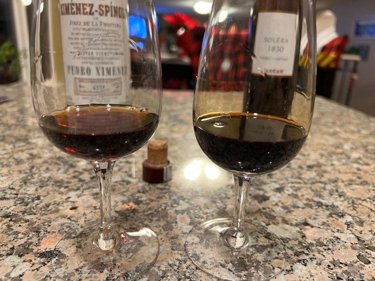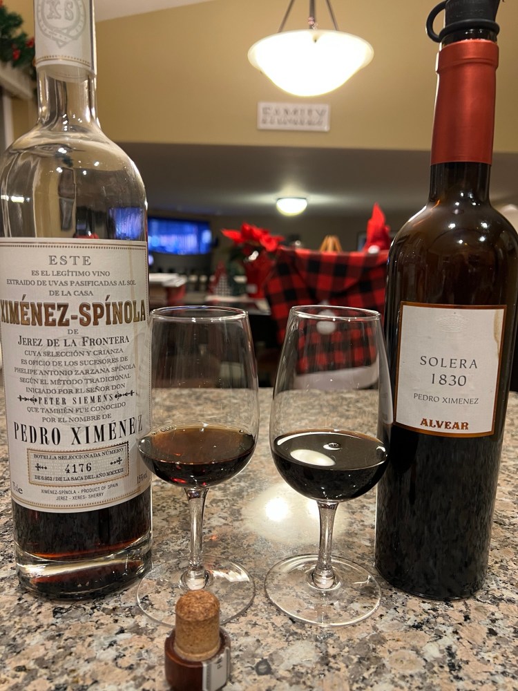 This week, I had a 1830 Alvear Solera PX and a 1918 Very Rare Ximenéz-Spínola PX. These wines are both brown in color, with the 1918 being transparent (similar to vanilla extract) and the 1830 being deep brown and opaque (similar to dark corn syrup or molasses). This is a good time to click back to last week’s post about non-oxidative PX and see that all three of these wines started out as the same light color!! The 1830 coats the glass like motor oil coating the drip pan when draining the old oil. The 1918 has aromas of vanilla bean, raisins, nutmeg, walnuts, toffee, chocolate, coffee, and dried figs. The 1830 has raisins, molasses, dark chocolate dark brown sugar, fig preserves, and caramel. As you can tell, these wines differ significantly just in their aromas and appearance. These differences continue on the palate. The 1918 has more acidity and alcohol while the 1830 has a fuller bodied texture. The 1830 is far more viscous and feels like it is coating my mouth and throat. Both of these wines are lusciously sweet, but the sugar content of the 1830 is higher (coming in at a staggering 480 grams per liter, compared to a mere 350-400 grams per liter in the 1918). The prolonged solera aging of these wines allows for evaporation of water and alcohol in the summer heat of Andalusia, Spain. This helps further concentrate the flavors that develop during the oxidative process. These wines were a fun splurge and fascinating to compare side by side! They are both phenomenal treats after a long day during the holiday season! If you scroll back to the PX post from December of 2020, you will see that these vary tremendously from the Osborne discussed in that post!