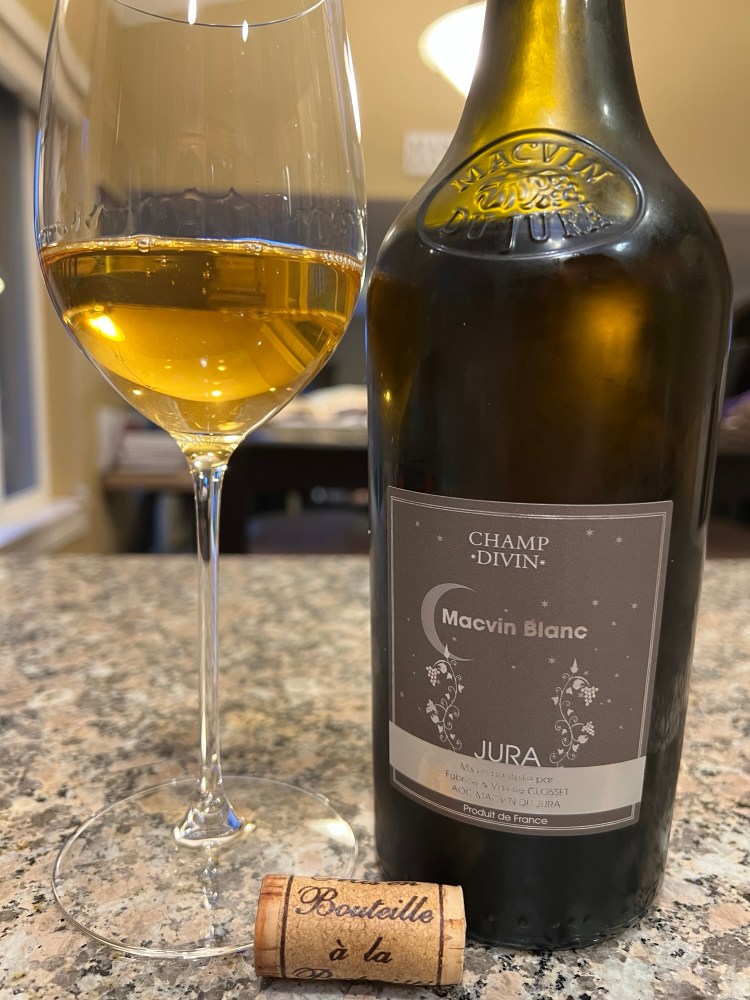 The wine I drank this week is a non-vintage (NV) Champ Divin Macvin du Jura. This wine is fortified then aged for 2+ years and blended. Prior to this aging, the marc is aged in barrels for over a year. According to the producer, it is then aged in barrels for at least a year after blending. Champ Divin uses 100% Chardonnay in their Macvin du Jura. This wine is a vibrant lemon yellow color and coats the inside of my goblet as I swirl my glass. Aromas of hazelnuts, golden raisins, toffee, walnuts, dried pineapple and candied orange peel jump from the glass. This sweet, full bodied wine has a high level of alcohol. The significant level of acidity is well integrated and balances the residual sugar. The nuttiness on the front palate gives way to dried and candied fruits on the mid palate and extended finish. This is a very unique and interesting wine to drink on its own as an aperitif. It should be chilled or poured over ice (this is a rare instance when I would recommend wine with ice!). It can be paired with desserts, light cheeses or a cheesy risotto. This is unlike most wines you’ll drink but definitely worth a try!