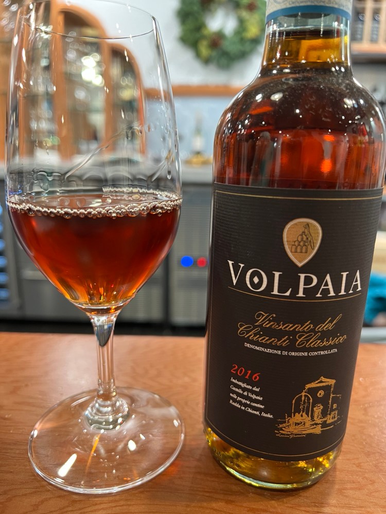 The wine I drank this week is a 2016 Volpaia Vinsanto del Chianti Classico. This wine undergoes an extended barrel fermentation process that can last up to 5 years. During this time, the wine is stored in the attic of the winery. The attic has the largest temperature fluctuations and allows for a slow maturation process as well as baked fruit notes in the final product. This wine is a medium amber color with aromas of raisins, molasses, roasted almonds, cherry cordial, apricot jam, and nutmeg. On the palate, this sweet wine is well balanced with a higher level of acidity. Compared to last week’s wines, this wine is low in sugar at only 130g per liter (Mountain Dew is about 120-130g per liter). It does have a high level of alcohol, around 15% ABV, which contributes to its full bodied texture. The sweet fruit notes are pronounced then give way to almonds on the extended finish. I paired this wine with blue cheese…again! I’m having fun sipping these sweet wines with blue cheese during the wet, cold, short winter days in the Pacific Northwest.