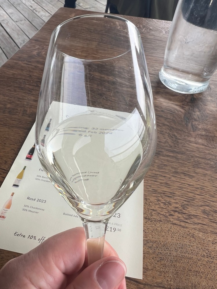 While I was in England, I went wine tasting in Kent at Woodchurch Wine Estate. While there, I tasted their 2023 Field Blend that is 50% Bacchus and 50% Chardonnay. This pale lemon wine had aromas of elderflower, white grapefruit, lemon pith, lime zest, fresh cut grass and a steely minerality. On the palate, this dry wine had ample acidity to balance its fuller body. It was refreshing and had a low to moderate level of alcohol. The herbaceous and citrus notes were apparent on the front palate with the steely character being more prominent on the back palate. This wine had a longer finish. It would pair well with oysters or sushi. It could also be served as an aperitif or with acidic cheeses like feta or herbed goat cheese.