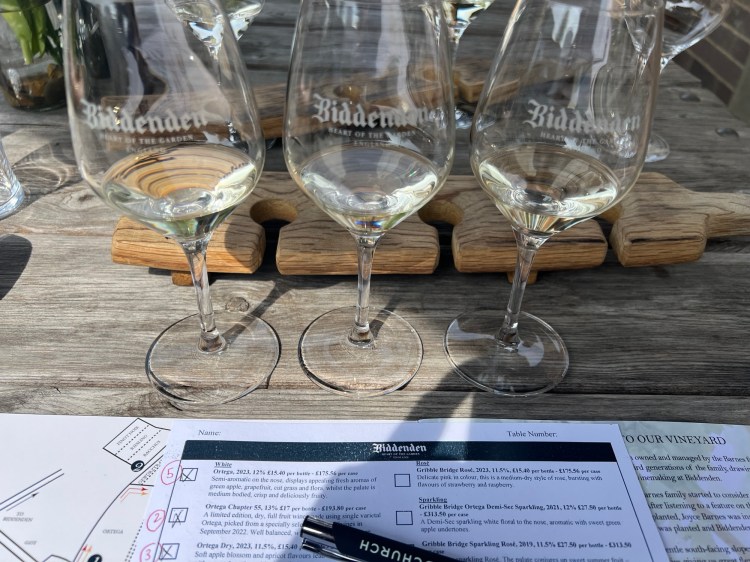 On my recent travels, I stopped at Biddenden Vineyards and tasted their lineup of Ortega. They offered three different styles during my visit. There was a 2022 Chapter 55 limited edition version with grapes from a selected block (#1), a 2023 Ortega that had more intense aromatics (#2), and a 2023 with less aromatic fruit (#3). They were all pale lemon in color. Number 2 and 3 displayed floral notes and riper stone and melon fruits while #1 was more vegetal, herbal, with green apple and lemon pith. All three had a moderate level of acid and were noted as being dry but there was a perceptible amount of residual sugar in #3. Number 2 and 3 were low in alcohol, but #1 was more moderate. They all had a moderate to full body. Number 3 had the longest finish. These were all great wines and interesting to try them side by side to see the variation between them. Number 3 would be a great aperitif as well as pair well with seafood, lighter fish and the touch of sweetness would make a great compliment to spicy foods like Thai or Indian cuisine. Numbers 1 and 2 would also be great with seafood and light fish. If you happen to be in Kent, I recommend stopping in for a tasting!