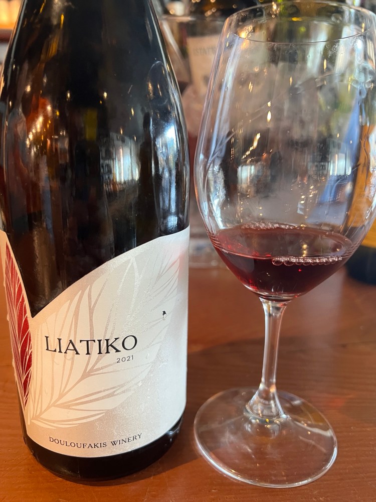 During the Greek wine tasting, I had a 2021 Douloufakis Liatiko. This wine is 100% Liatiko. According to Douloufakis, the best expressions of Liatiko occur when yields are limited and grapes are not allowed to over ripen. They also recommend serving this wine at a cooler room temperature (around 62°F, 17°C) in a Burgundy style wine glass, if available. This pale ruby wine displayed ample red fruit notes, such as strawberry, red cherry, and ripe raspberry. There are also aromas of leather, earl grey tea, and wet stone. This dry wine has higher levels of acid and alcohol but is lighter in tannin and body. The bright red fruit notes linger on the long finish. This wine would be great with lamb chops, cured meats or aged cheeses.